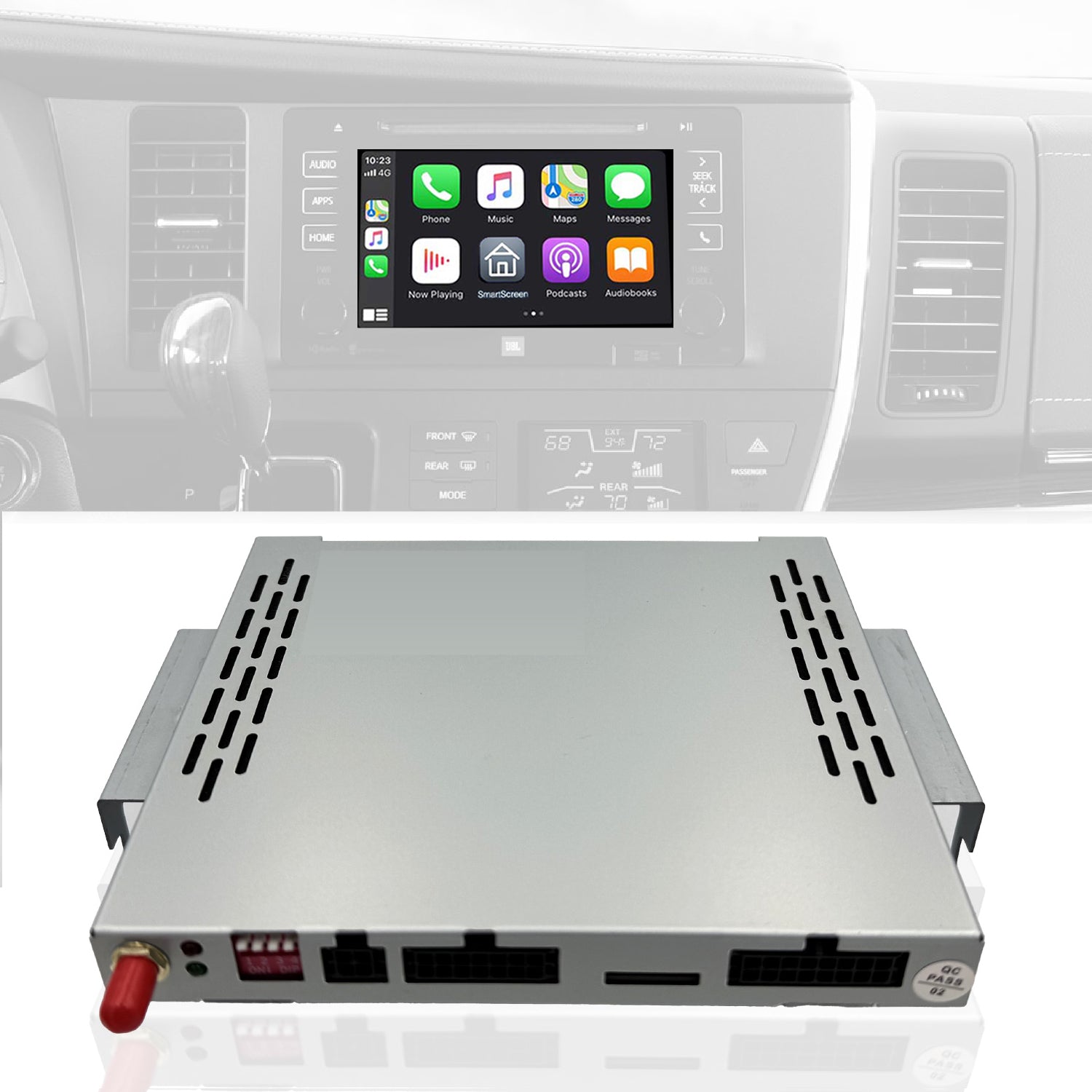 All in one slim small box that mounts directly to your radio unit (intermediate level installation is required). This product seamlessly enhances the original factory system by adding an intermediate module. It preserves the car screen, style, and functions while enabling CarPlay/Android Auto and Mirroring, transforming it into a versatile all-in-one intelligent radio unit.